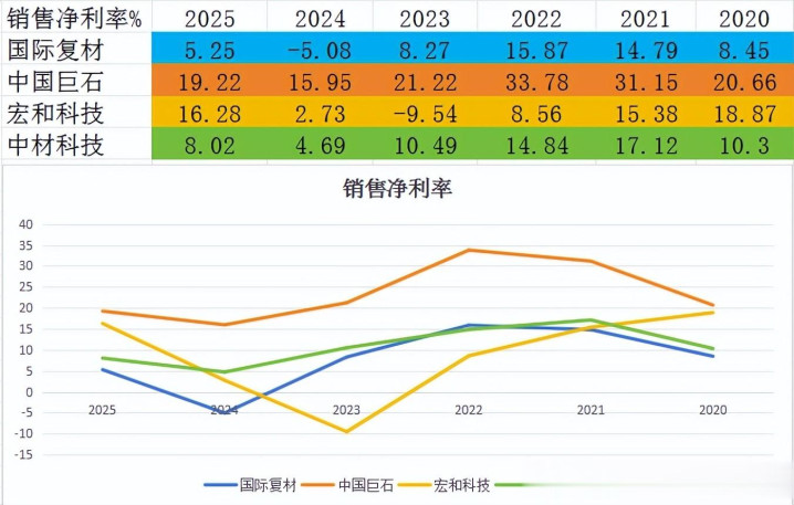 盈利才智排活动:中国巨石>宏和科技>中材科技>国际复材。