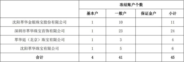 多家金融机构已针对公司借债落后问题拿告状讼或仲裁,再重叠部分条约纠纷要素,导致萃华珠宝及子公司主要银行账户被东谈主民法院冻结,这对公司业务开展带来要紧影响。贬抑2026年2月6日,被冻结银行账户多达45个,幸运彩其中包括4个基本户、41个一般户,施行冻结累计金额为472万元,波及沈阳萃华金银珠宝股份有限公司、深圳市萃华珠宝首饰有限公司等主体。鉴于此,萃华珠宝股票来回被履行其他风险警示。