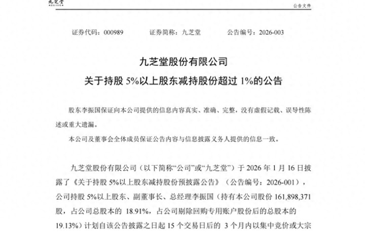 晓喻没多久,2月10日晚间,九芝堂就发布公告称,李振国通过大批交往减捏公司股份862万股,占公司剔除回购专用账户股份后的总股本的1.02%。