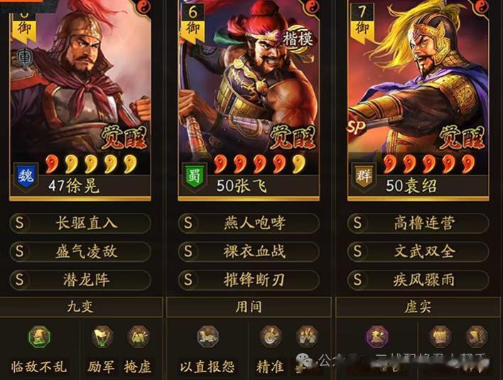 2、SP袁绍+张春和夏侯渊的组合其实亦然不错的,径直走弓兵道路,让SP带风卷残云,夏侯渊带突击战法,张春华带个无当飞军或盛气凌敌就能很丝滑了!觉悟后统御相比高了以后,不错把张春换成左慈进行调和,裁减垦荒的战损和难度!