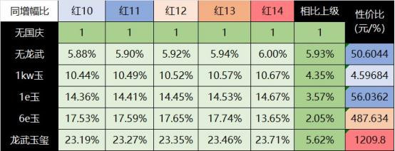 因为先前的计较忽略了一些细节,低增幅从上限扣得更多,背面扣得少,是以其实对高增幅性价比是高估了的。然而仍是不错粗略参考一下。(如若红10奶默许为白嫖现象,那么11的性价比降到了132元/1%)