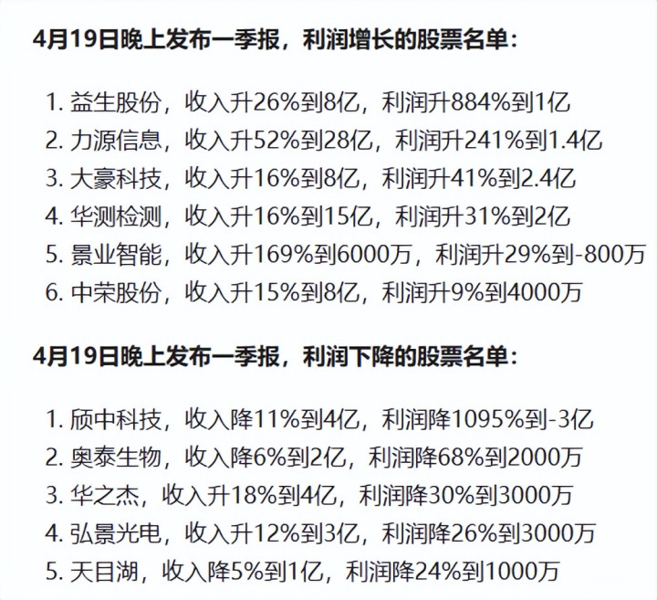 一季报的雷近年报来得更猛。4月19昼夜深,11家公司扎堆露出了一季度得益单,功绩分化之剧烈号称冰火两重天。益生股份净利润同比飙升百分之八百八十四,力源信息增长百分之二百四十一,大豪科技、华测检测也交出两位数增长。但另一边,颀中科技利润断崖式暴跌百分之一千零九十五,径直亏掉三个亿,奥泰生物、华之杰、弘景光电、天目湖也集体拉响警报。这份夜深得益单,让大批散户蜿蜒难眠。