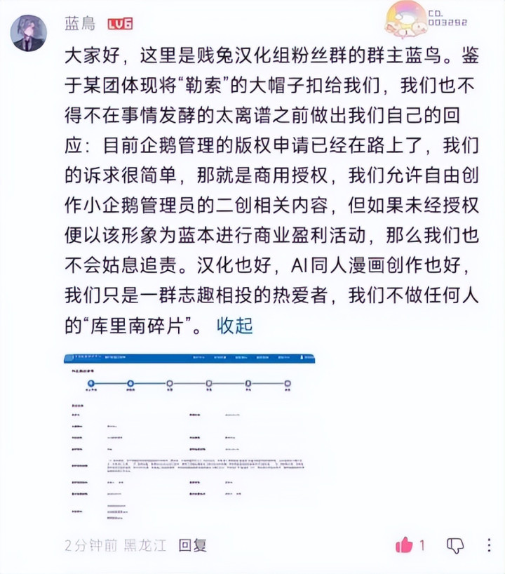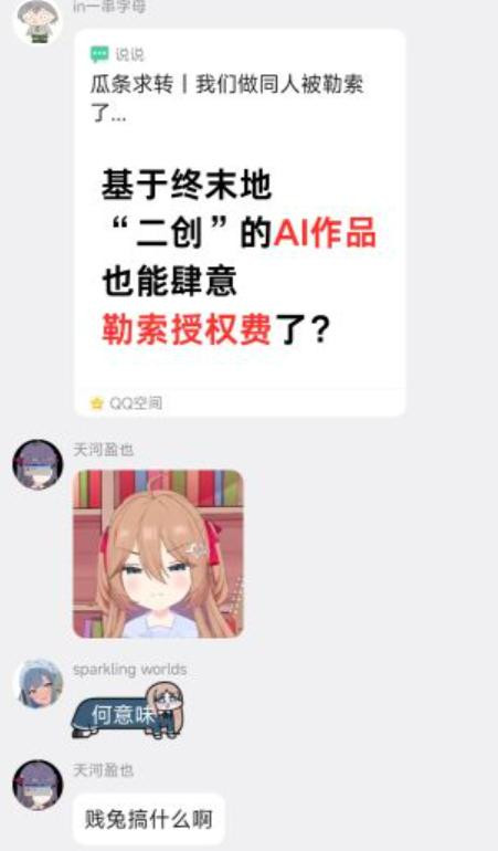 可没料想这种二创玩的东西,目下尽然发展成了版权争议事件,我在QQ群里刷到有东说念主乞助,说我方作念的最后地“二创”的AI作品被威迫授权费了。