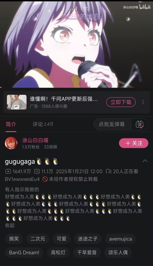 而简直把咕咕嘎嘎跟企鹅聚首到是旧年B站UP主“涂山白白喵”作念了一条整活视频,他把“咕咕嘎嘎”的企鹅音效,配到了高松灯身上。