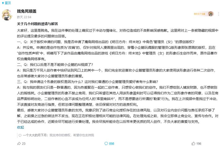 1、莫得肯求官方扮装版权,他肯求的仅仅:“企鹅玩偶服处理员Q版形象”而且明确标注是基于《明日方舟:最后地》的二创作品。