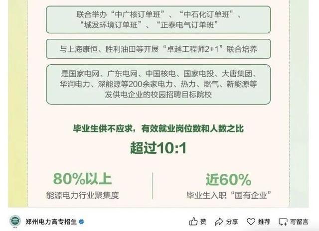 最新的作事数据涌现,近60%毕业生皆能入职国有企业,有多个订单班,每年国度电网、广东电网、中国核电等多个大型企业皆会去校招。