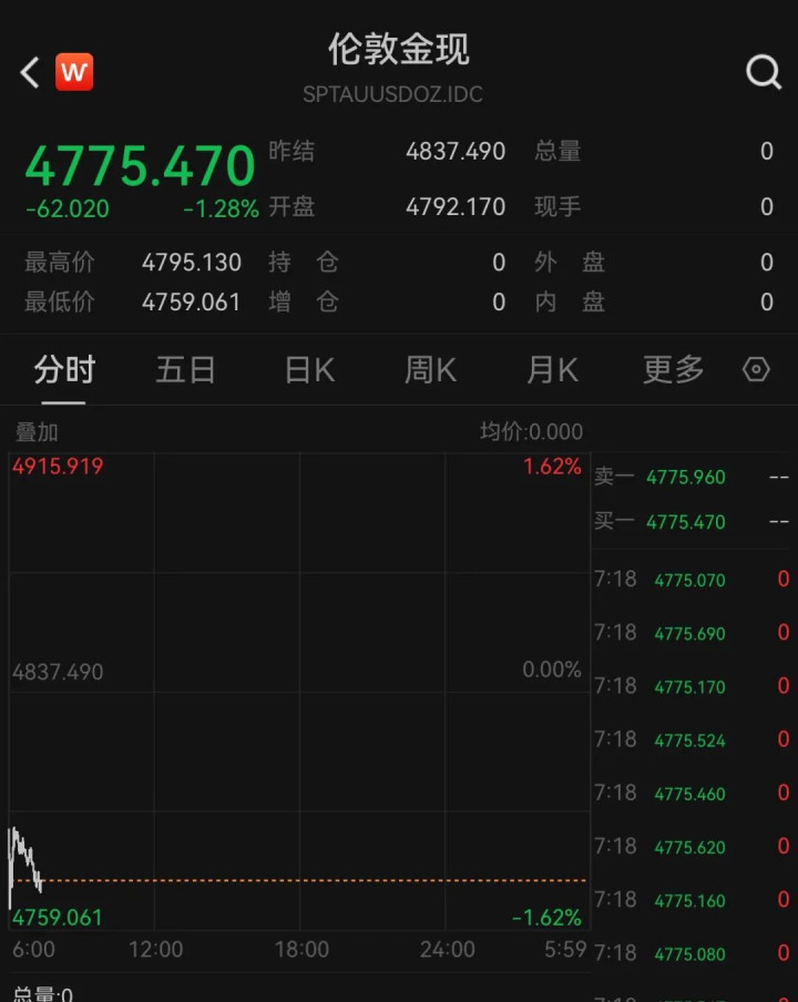 与此同期,外洋金价开盘下降。现货黄金跌破4800好意思元,现报4775.470好意思元/盎司,跌1.28%。