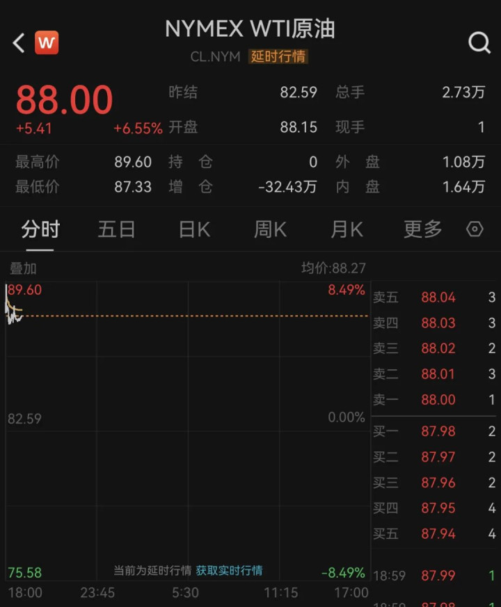 北京时辰20日早间,外洋油价大涨,WTI原油盘中一度涨超8%,最高报89.60好意思元/桶,规矩发稿,涨6.55%;ICE布油最高潮超7%,开云体育现报95.73好意思元/桶,涨近6%。