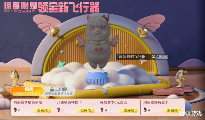 如图所示,得到“惊喜驼驼”分为2个阶段,第一个阶段需才调有手册、特权、赛季首充以及麦兜特惠;第二阶段则是通过逐日插足游戏、好友赠予来得到钥匙,当神志疏导期就不错径直领取到这个可人的飞翔器了~
