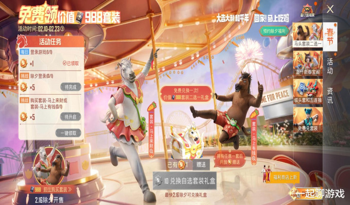 如图所示,得到“马皮”2选1的任务照旧挺简短的,插足游戏每天不错得到1个乐土币、除夕本日颠倒得到5个乐土币,当囤积到10个乐土币后,就不错在白马、黑马之间承袭其中一套来径直兑换得到。